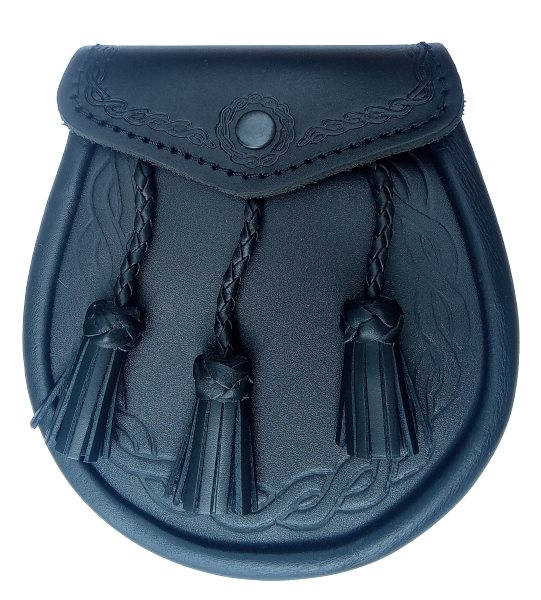 Sporran de cuero negro con grabados de entrelazado celta y tres borlas decorativas.