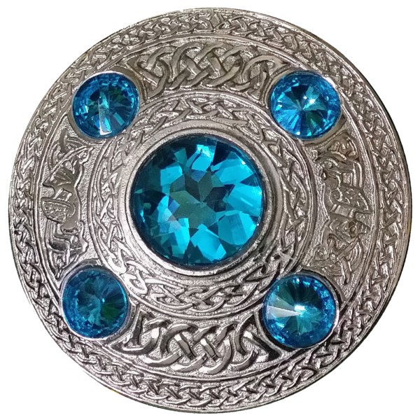Elegante broche decorado con entrelazos celtas y cinco piedras sintéticas de color azul zafiro.
